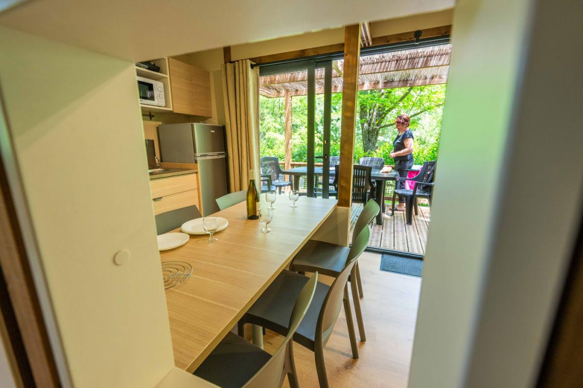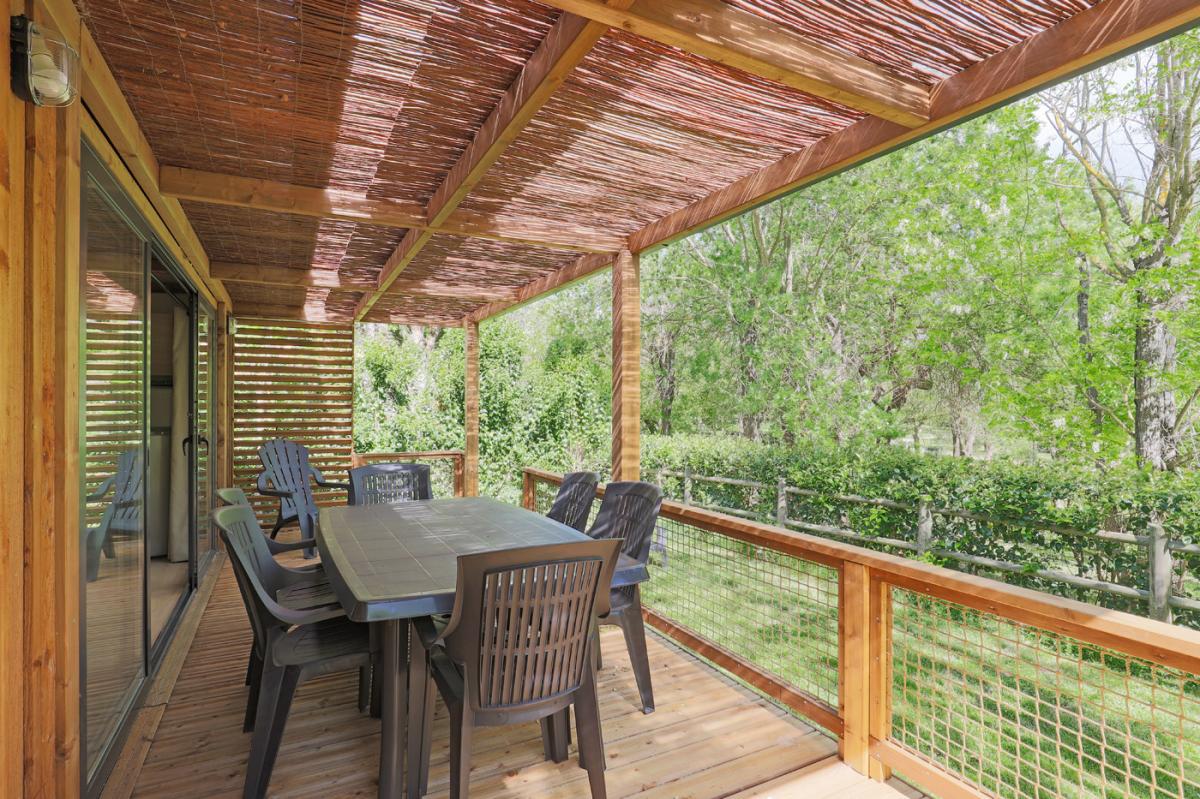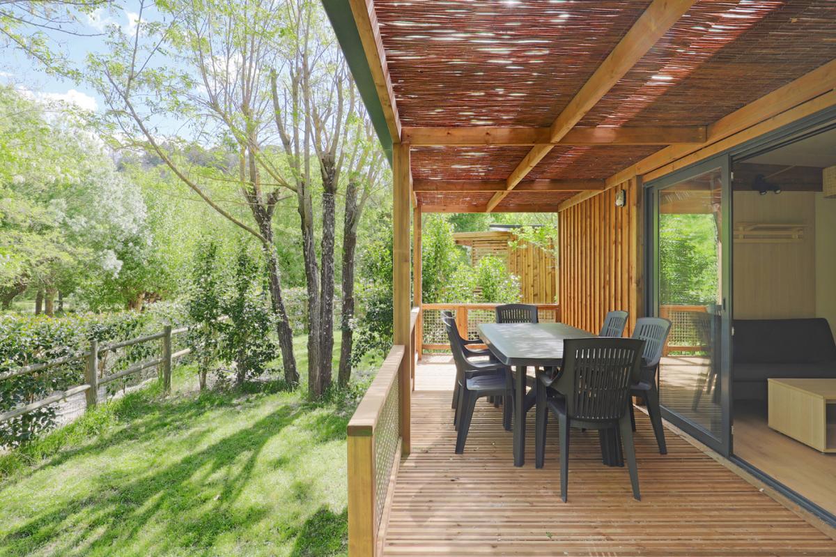 Il offre un espace de vie dedans/dehors très appréciable au sein de notre camping dans le Gard : la pièce de vie donne accès à la terrasse par une grande baie vitrée de 4 mètres.