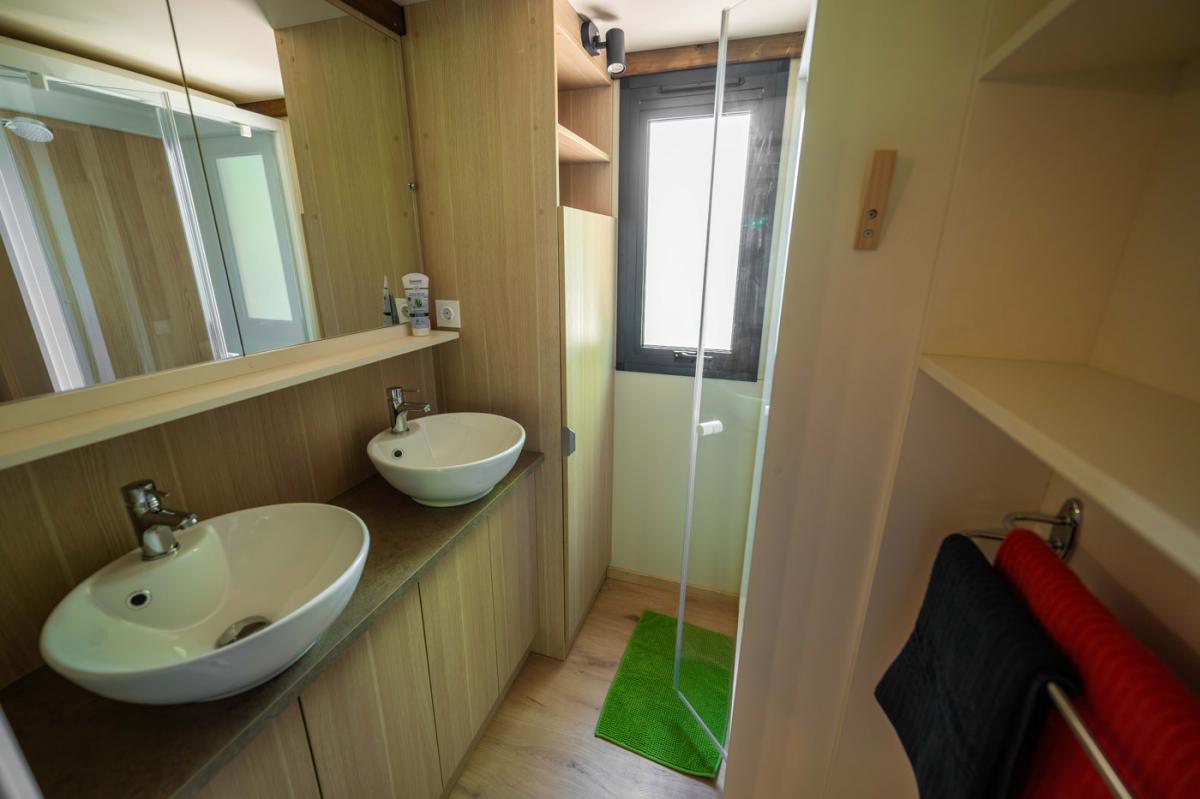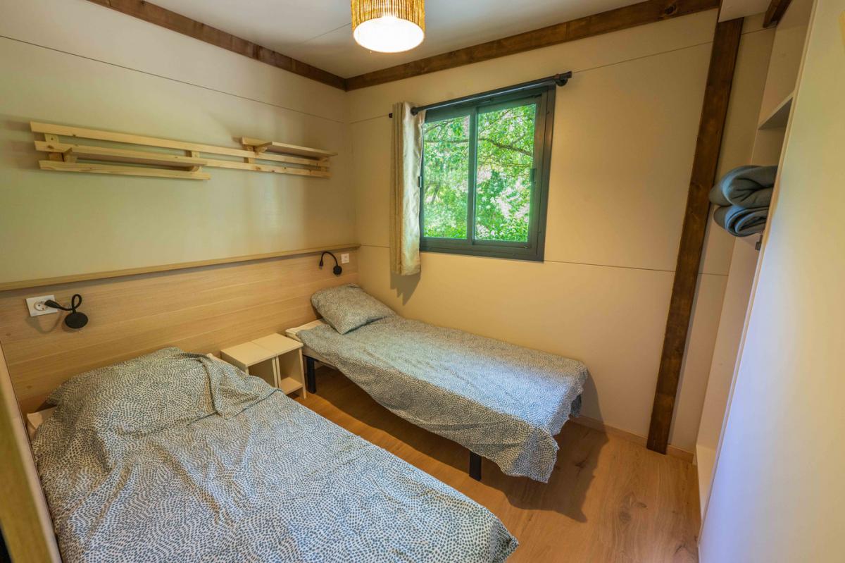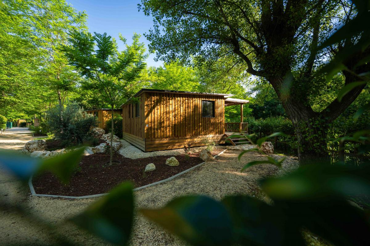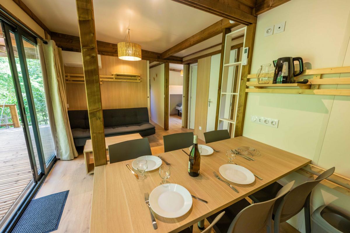 Il offre un espace de vie dedans/dehors très appréciable au sein de notre camping dans le Gard : la pièce de vie donne accès à la terrasse par une grande baie vitrée de 4 mètres.