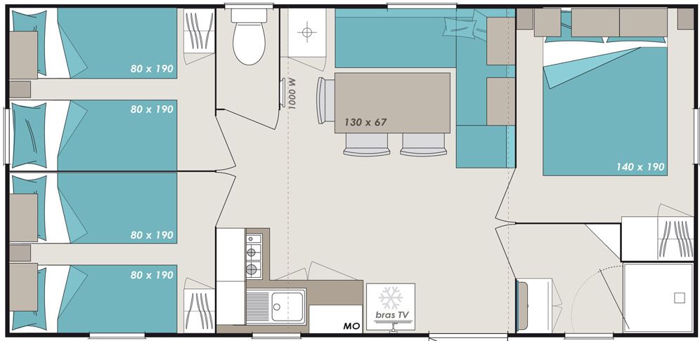 Ce modèle avec 3 chambres est idéal pour les séjours en famille avec les grands parents, ou entre amis.